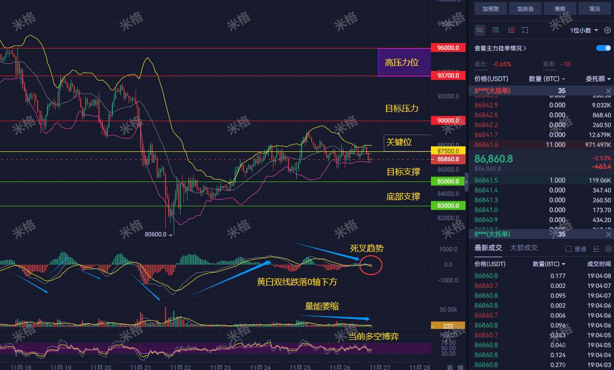 Personally, I lean bullish, as market sentiment and capital flow still favor the bulls. Although there is a dead cross signal, the bulls still dominate the market. Looking at two scenarios: if it breaks above and stabilizes at 89000, we can look for a surge above 93700; if it falls below 86000, the re-entry point can be around 84000, with support at 83000.