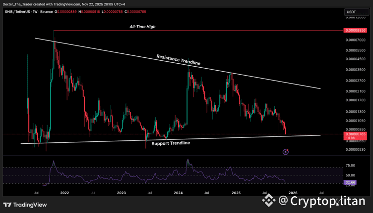 Shiba Inu In Critical Phase Amid Years of Consolidation in Lowering Triangle