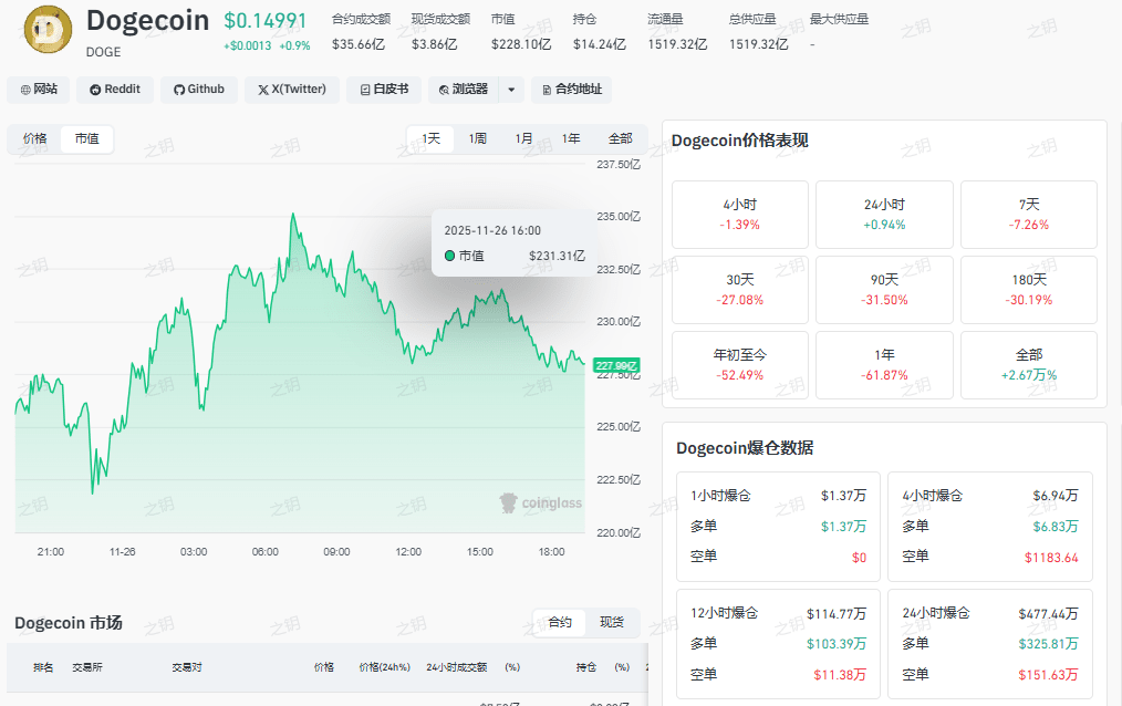 First, let's look at the data: DOGE is currently priced at $0.14991, with a slight drop of 0.9% in the last 24 hours, but its market capitalization remains as high as $23.1 billion. From the one-hour candlestick chart, DOGE is overall in an upward trend, but the key question arises: can it break through the resistance level above?