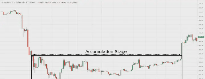 积累阶段的外观类似于一个区间市场,但它处于下降趋势之中,如下图所示。