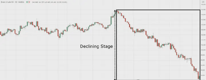 下降阶段是一个下降趋势,由一系列依次降低的价格高点以及依次上升的价格低点所构成。在这个阶段,大多数交易者能够识别出趋势,并正在寻找卖出机会,以下是一个示例。