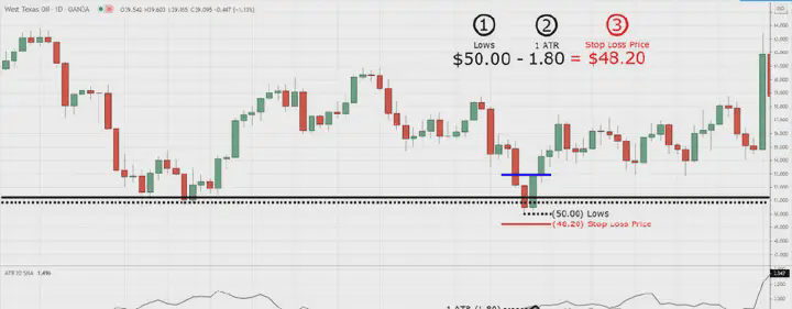 我的偏好是为其提供一个低于支撑位1个ATR(平均真实范围)的缓冲区,以防止“停止狩猎”,具体操作如下: