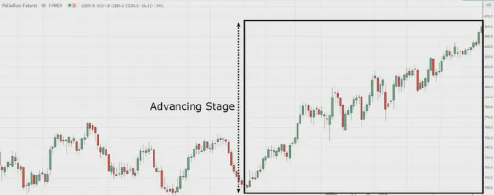 因此,如果您在积累阶段持看跌态度,那么您可以在阻力位寻找卖出机会。或者,如果您持看涨态度,那么您可以在支撑位或价格突破阻力位时寻找买入机会。当这种情况发生时,我们将进入下一个市场阶段。