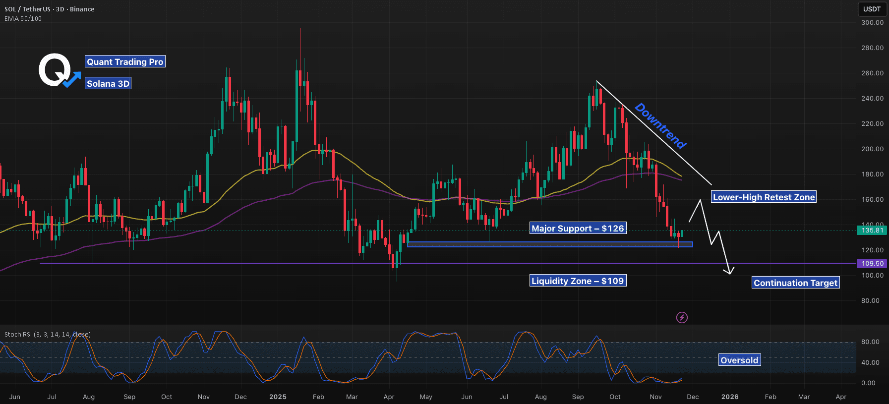 SOL is clearly in a downward trend daily, with a price consistently making lower highs under the descending trend line. The price is now retracing to a potential lower high test area, directly aligning with the overlap of the 50/100 moving averages above it. Unless SOL can reclaim this line with a strong daily close, these setups favor a continued downward trend.