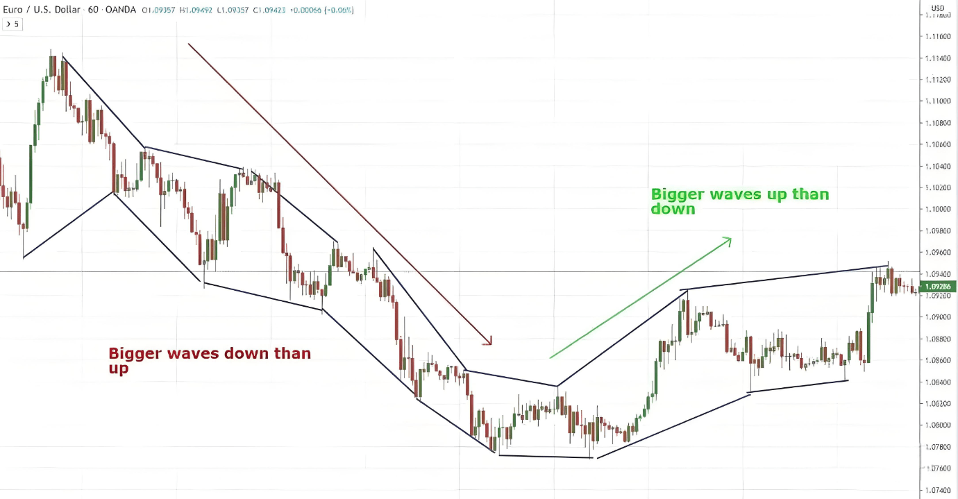 As the price chart progresses, trends can reverse as the downward waves begin to become larger than the upward waves.