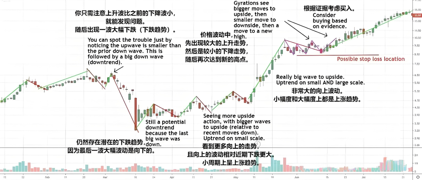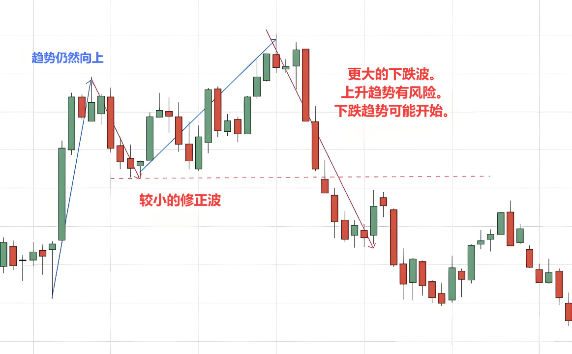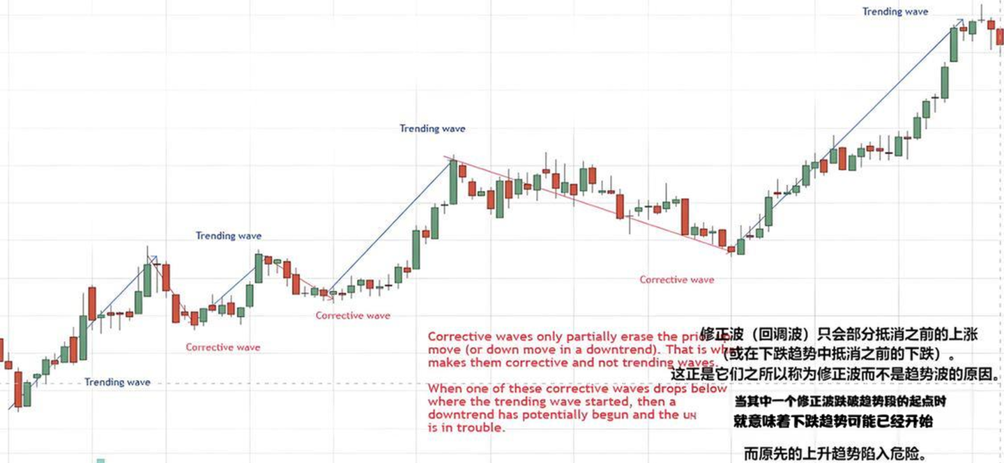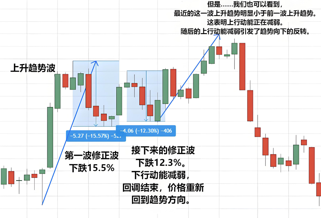 Trend waves must be larger than retracement waves; otherwise, the price will not 'advance'. When a retracement wave becomes as large as the previous trend wave, it usually means the trend may be reversing or the market may be entering a consolidation phase. The reason is that to form a trend, the retracement wave must be smaller than the trend wave; once the retracement wave is too large, the trend becomes questionable.
