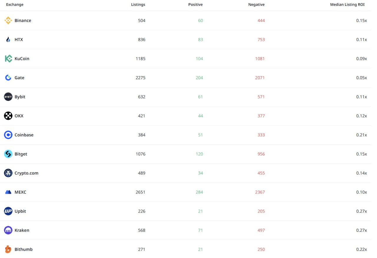 1️⃣ Listing coins is no longer a 'money printing machine': Unlike in 2021, the ROI is mostly negative on any exchange now. Market Makers (MM) and VCs have changed the game.