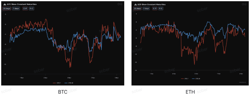 Term structure: Both short-term (7 days) and medium-term (30 days) skews remain negative, with a greater correction in short-term skew, indicating that market concerns about near-term risks have eased, but the overall structure remains defensive.