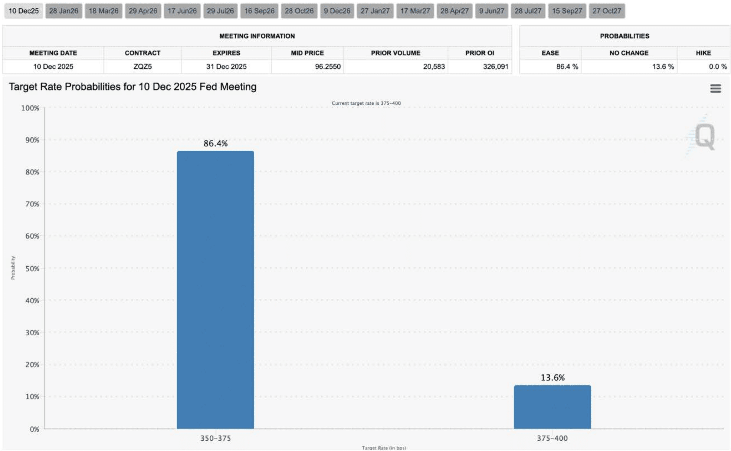 Background review: Previously, although the Federal Reserve had completed two rate cuts, the market's expectation of 'whether there will be a third rate cut this year' fluctuated between 50% and 70%, due to the U.S. government shutdown getting caught in a 'data fog.' This uncertainty has pushed up short-term risk premiums and intensified market volatility. Last week, according to CME Group FedWatch futures data, the market's expectation of another rate cut on December 10 has risen significantly to 86%, an increase of 15 percentage points from the previous week, indicating that rate cut expectations have become significantly aligned.