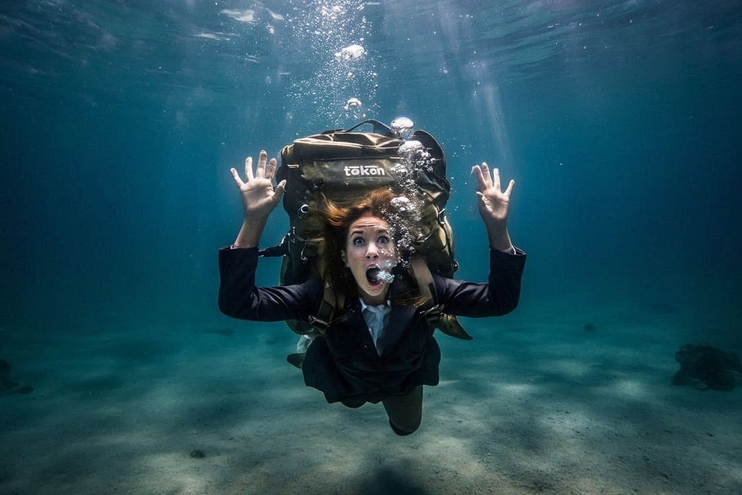 And the image says it all: there we are, trying to breathe while that bag slowly pulls us down. 🌊😵💫