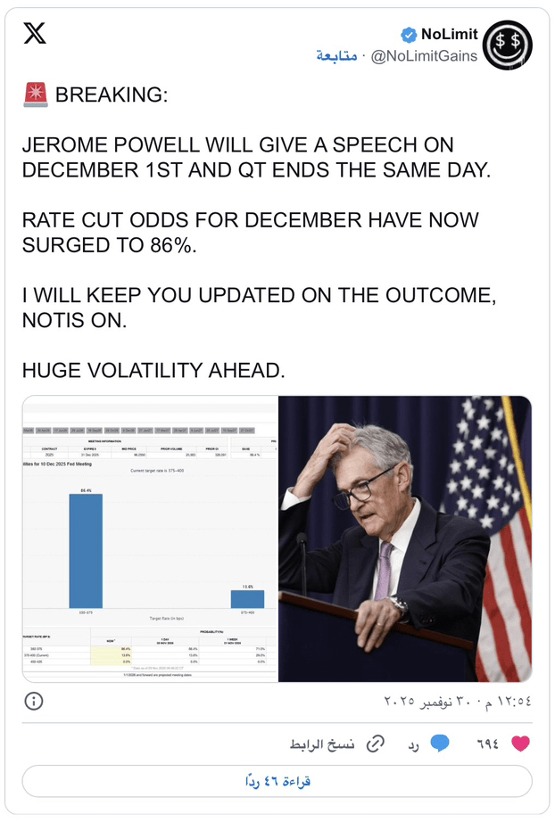 Bitcoin investors face a crucial week with Federal Reserve Chair Jerome Powell's talk on December 1, coinciding with the end of the official quantitative tightening (QT) policy. With the odds of a rate cut in December now raised to 86%, significant volatility is expected across risk assets.