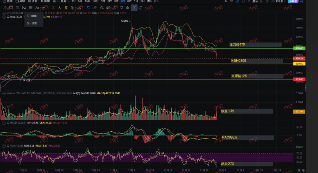 Looking at the 1-hour K-line chart of ZEC again, the current price is $360, the resistance level is at $470, the key level is $300, and the support level is $125. In terms of indicators, the trading volume has increased and fallen, indicating significant selling pressure; MACD has shown a death cross, suggesting a bearish short-term trend; however, RSI has entered the oversold zone, and historically, this position is prone to trigger a technical rebound. Simply put, ZEC now resembles a spring, too tightly compressed may cause it to bounce. However, the trend has not clearly reversed; we cannot impulsively buy the dip just because it is oversold.