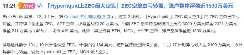 On December 1, the biggest short on Hyperliquid for ZEC finally got out of the position! This guy opened a short position in October at an average price of $419, and during the worst of it, he almost got liquidated with a floating loss of $21 million, but now he has actually turned a floating profit of $2.11 million, and the position size has decreased from $30 million to $23.21 million.