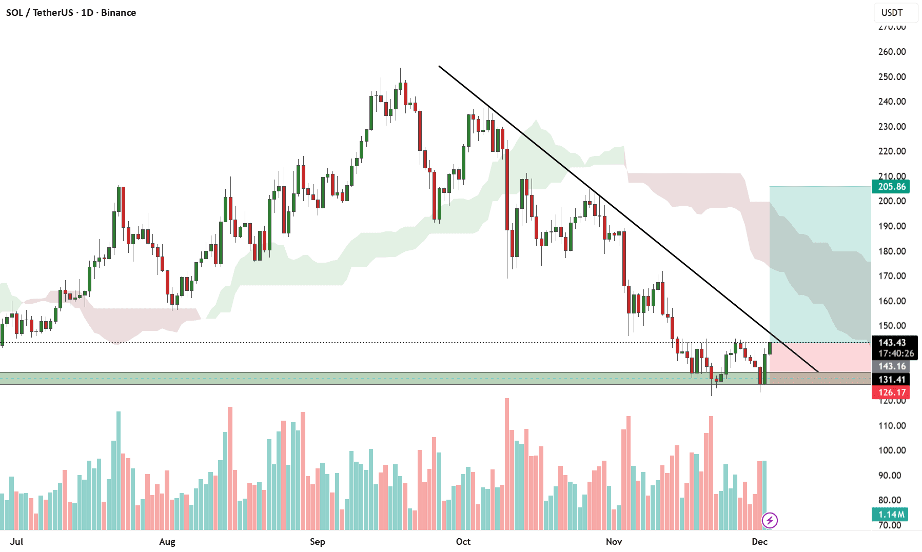 In a one-day chart, SOLUSDT is currently recovering strongly from a well-defined horizontal support area around $131 - $137, which has acted as a major demand zone several times in the past. Buyers are entering again from this area with an increase in volume, indicating interest in accumulation after an extended downtrend. The price has now pushed back above the short-term daily lows and is testing the downward trend line drawn from November highs, suggesting that the market is attempting to change momentum.