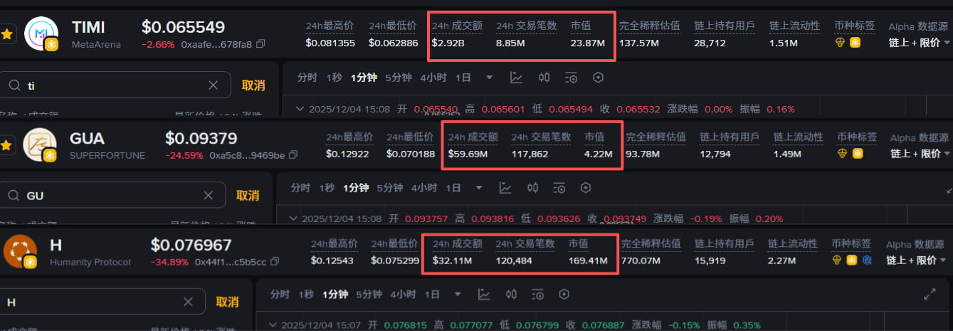 I'm comparing the data of the tokens that everyone is currently grinding, $TIMI and the newly released $H $GUA .
