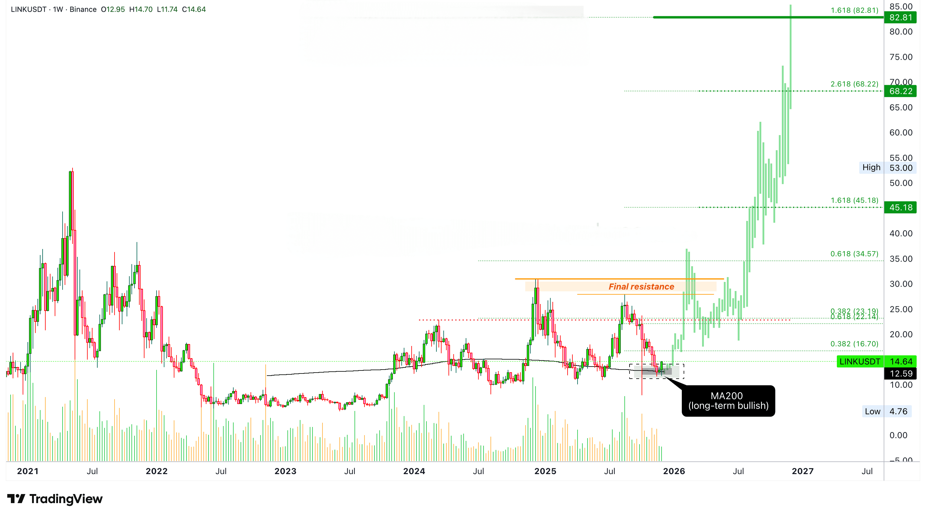 Here we have Chainlink in the long term, and we know that the upward trend is confirmed by multiple tests of support, with support in the form of MA200. This level is being tested repeatedly, and its stability is the strongest bullish signal we can get.