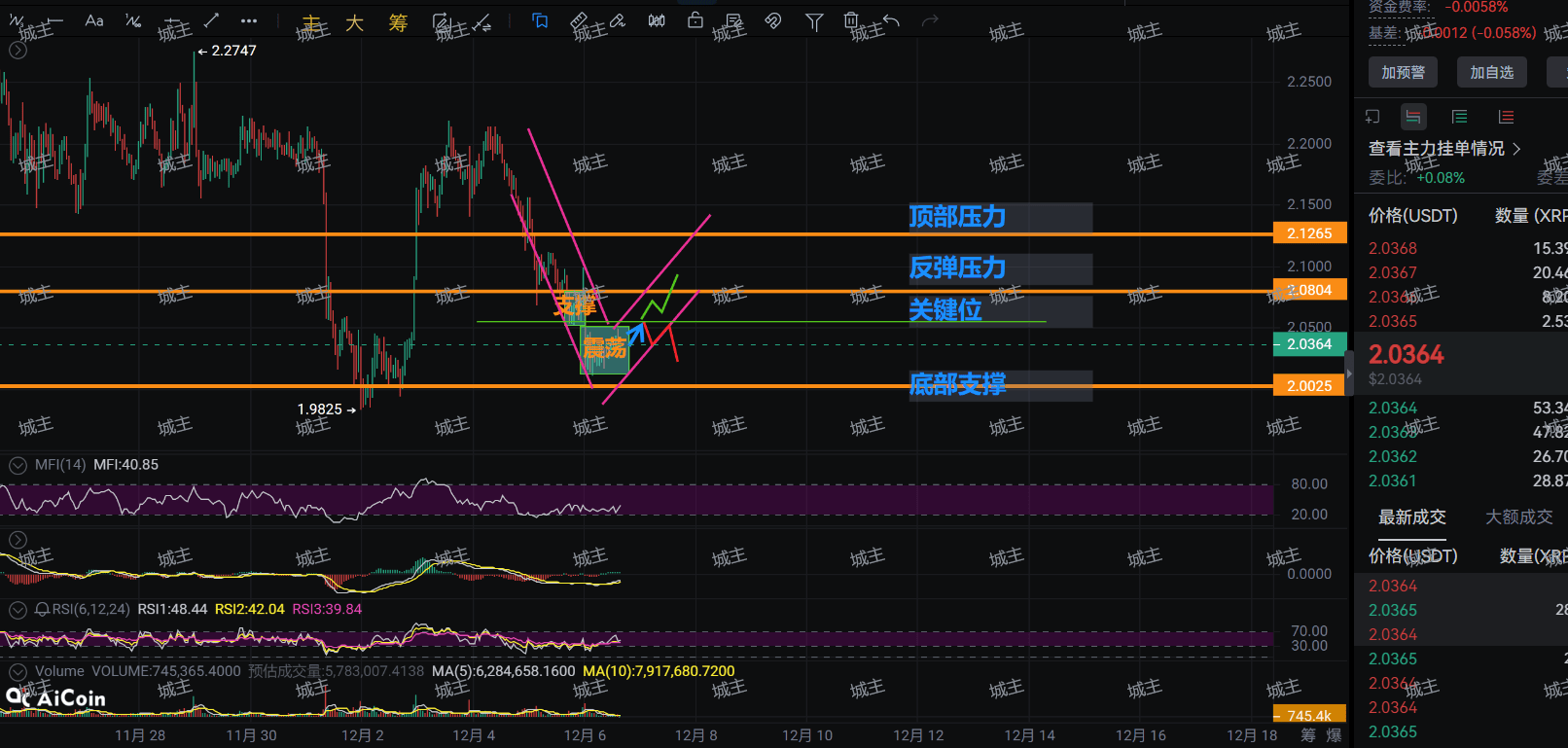 XRP is currently stuck just above the strong support at $2.035, which is the 'iron bottom' that technicians are firmly guarding! Last night it dropped to $2.011, and bulls quickly bought the dip to bring it back. The current price is hovering around $2.0364, clearly in the rhythm of 'fluctuating to accumulate'!