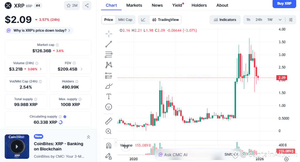 XRP price prediction for 2026 is looking at a clean 2x if the stars align, with some calling $3.50 by early 2026. Right now, XRP is sitting at $2.09 on Dec 5, bleeding 7% this week and chopping below major moving averages. Sentiment is deep in “Extreme Fear” zone.