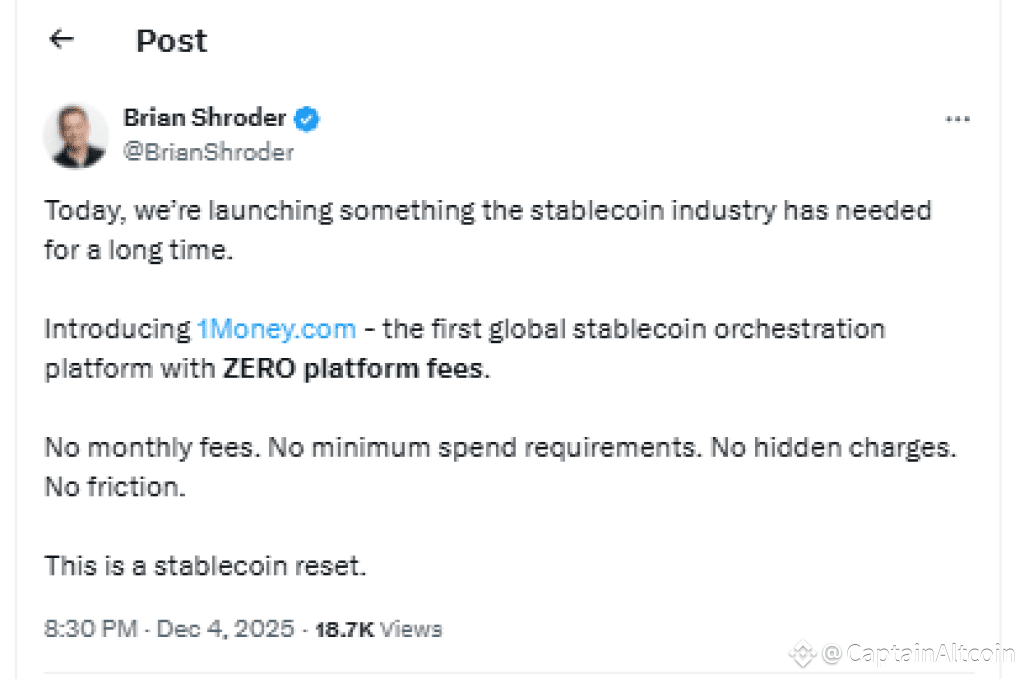 On Dec 4, Brian Shroder( Ex CEO of Binance) lit the match under the entire crypto payments sector. His new 1Money stablecoin platform dropped with zero platform fees, and it instantly shakes up the whole XRP price prediction story.