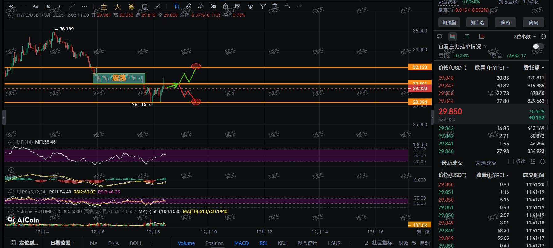 28.115 is the 'iron bottom support', 32.123 is the 'ceiling pressure'. Yesterday morning, HYPE bounced back and forth between 28 and 29 dollars, and 28 dollars held firm; then it 'whooshed' back up to around 31 dollars! Now the price is stuck at 29.8 dollars, just like standing at a crossroads—upward? If the bulls have strong momentum, it could touch 31.5 dollars; downward? It's likely to stop at 28.5 dollars.