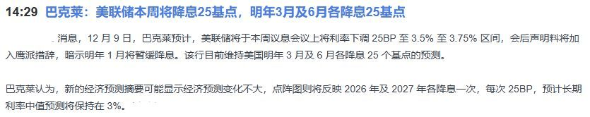 Did you see the messages just now? Wall Street giant Barclays has announced that the Federal Reserve will cut interest rates this week, and may continue to do so in March and June next year. For us in the crypto space, this is like a fire in winter, and in the long run, it's a warm breeze. The expectation of money flowing out of traditional markets has become stronger, which gives us confidence. However! It also stated that the Federal Reserve might 'say some tough words', hinting that there may not be a rate cut in January. This means the market will be tangled in the short term, and the行情 will easily fluctuate, creating a thrill.