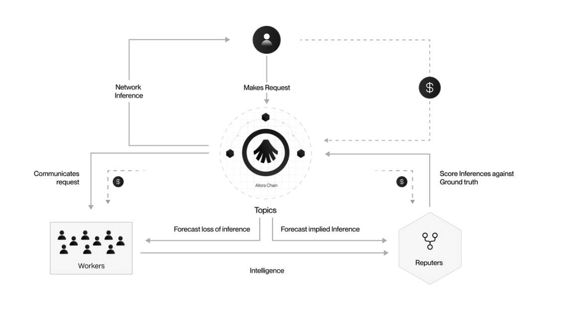 AI/ML agents in Allora both submit predictions and evaluate each other's predictions, aggregating predictions, scoring quality, and distributing corresponding rewards. Through this incentive mechanism, Allora continuously learns, improves, and adapts to the market.