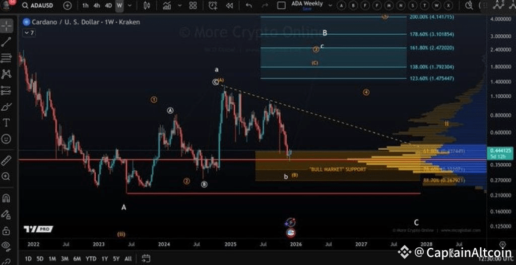 More Crypto Online took a wider look at Cardano, focusing on the weekly chart. He pointed out that the ADA price is trying to build a bottom inside a broad support zone between about $0.322 and $0.437. This zone has been important for months because so much trading activity has taken place there.