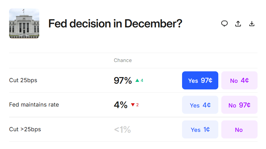 According to traders on Kalshi, the probability of the Fed cutting interest rates by 25 basis points has reached a record high of 97%.