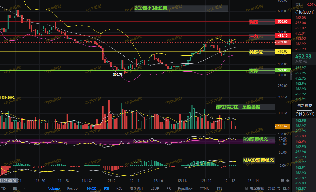 Although the price has rebounded to around 450, the volume has clearly shrunk, and the MACD red bars have just appeared, which is a classic signal of declining upward momentum! The strong resistance area is at 485, and 550 is an even harder ceiling to break. More critically, the RSI is in the observation zone; if it turns downward, it will trigger a cascade of selling. Key support is at 410 and 322. If it breaks, it will quickly test the 300 mark. This is not a prediction; this is a rule written in blood and tears by candlestick patterns!