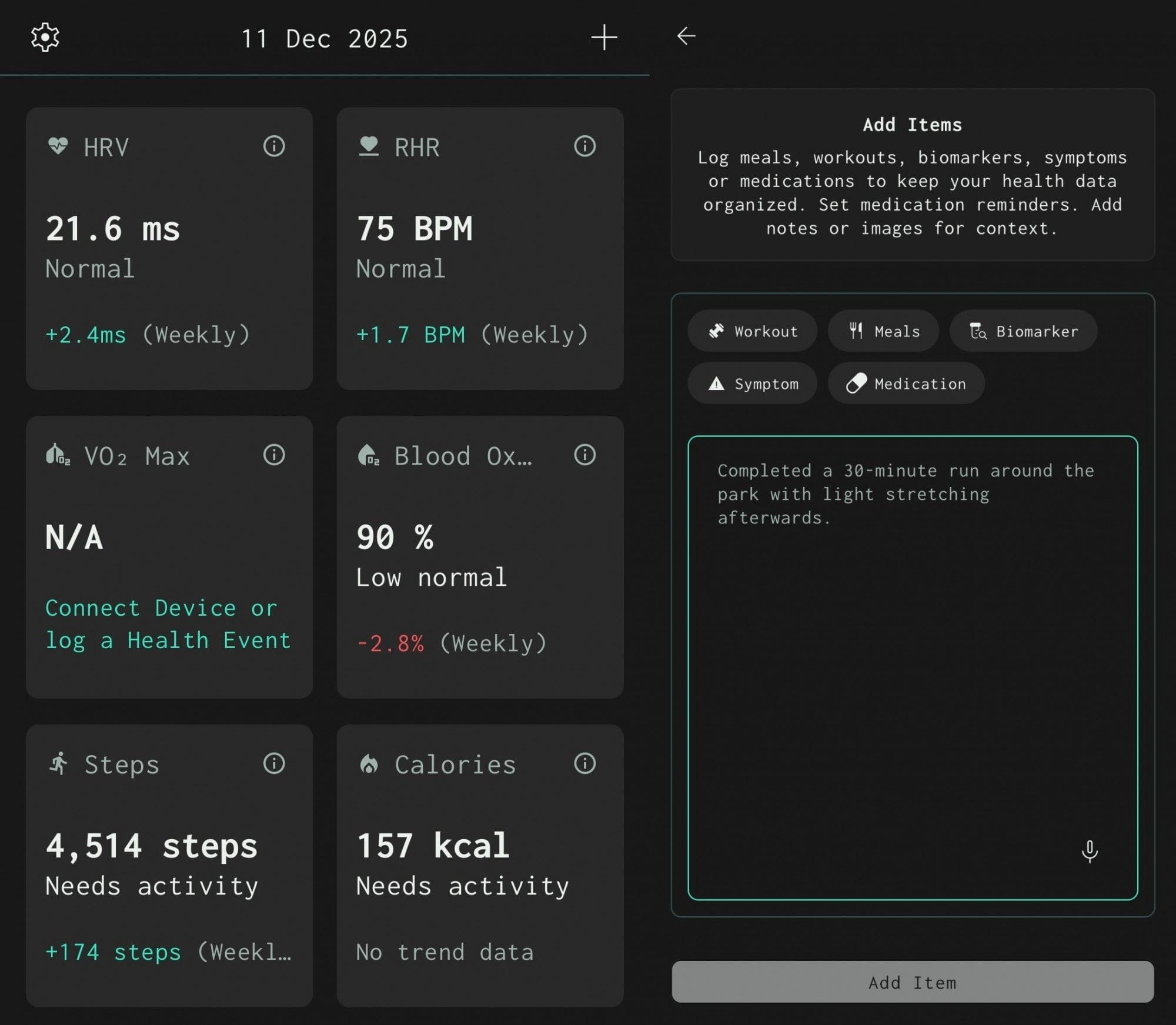 In addition, the application also supports natural language processing (NLP), allowing users to record exercise, symptoms, or medication usage through typing or voice, and AI will automatically understand the context and organize it into the user's timeline. This ability to perform cross-device associative analysis of the activity logs from watches and sleep metrics from rings is completed independently on the user's smartphone, ensuring the absolute privacy of the data.