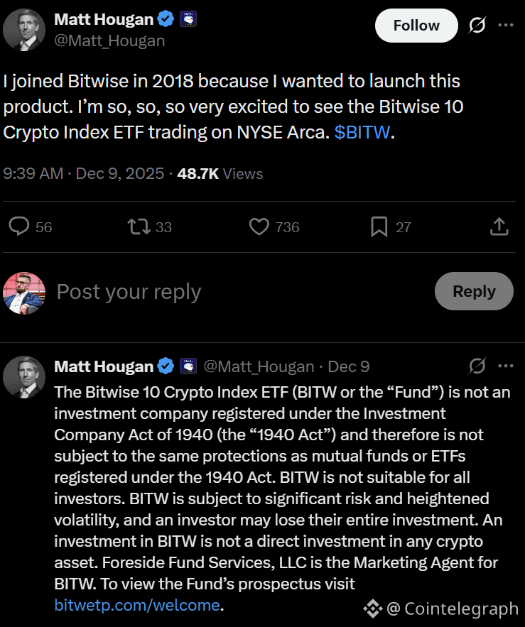 On Dec. 10, Bitwise Asset Management’s 10 Crypto Index Fund (BITW) transitioned from the over-the-counter market to NYSE Arca, broadening its visibility and opening the door to greater institutional participation. The fund is now available as an exchange-traded product.