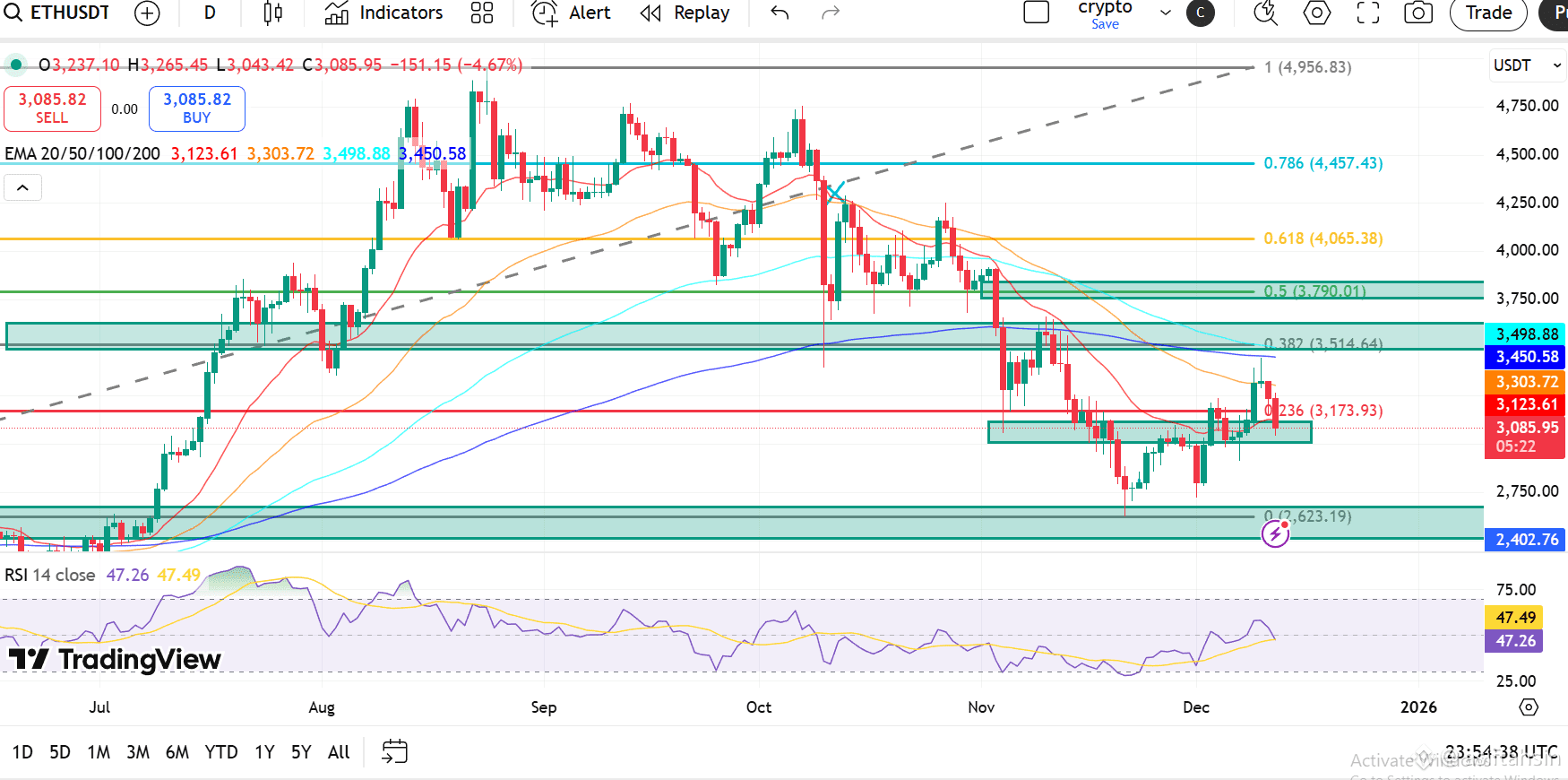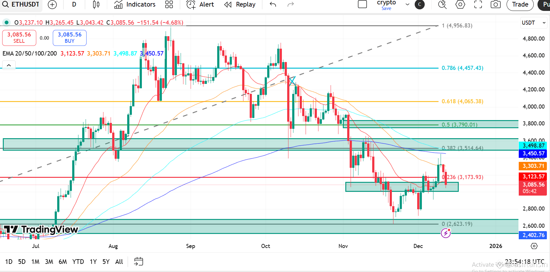 The decline accelerated after ETH faced repeated rejection near the $3,790–$4,065 resistance range, corresponding to the 0.5 and 0.618 Fibonacci levels, confirming strong seller presence at higher prices.