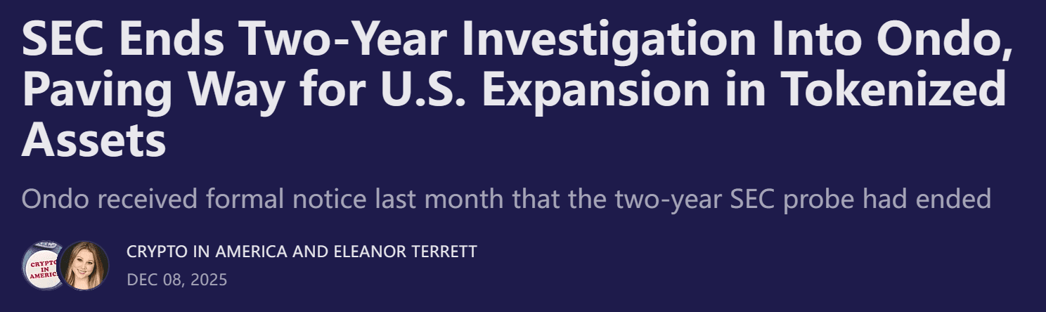 The U.S. SEC has concluded its two-year investigation into Ondo without bringing any charges.