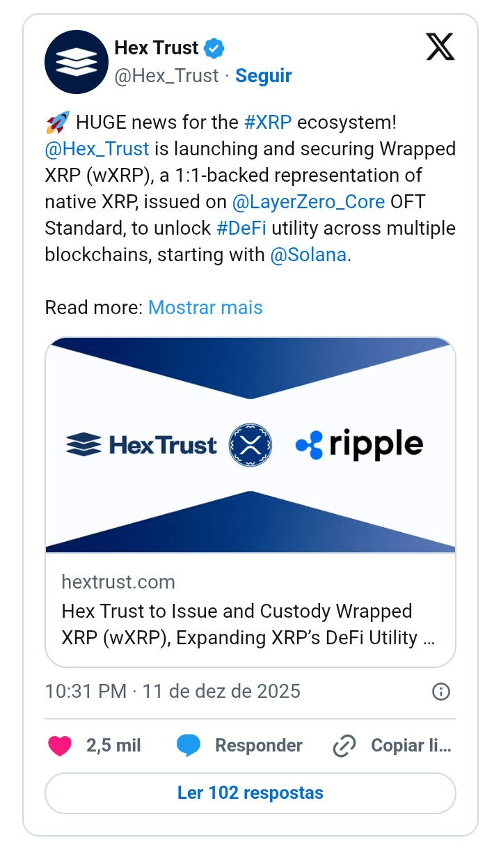 Hex Trust, a manager specialized in digital assets, announced on Thursday (11) the launch of wXRP, a 'wrapped' version of the XRP token that becomes compatible with the Ethereum and Solana networks. This new format, pegged in a 1:1 ratio to Ripple's original XRP, allows the asset to be used in ecosystems where it was previously unsupported.