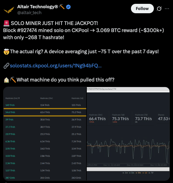 👉 A solo miner, not a large pool, not an organization, just mined a Bitcoin block.