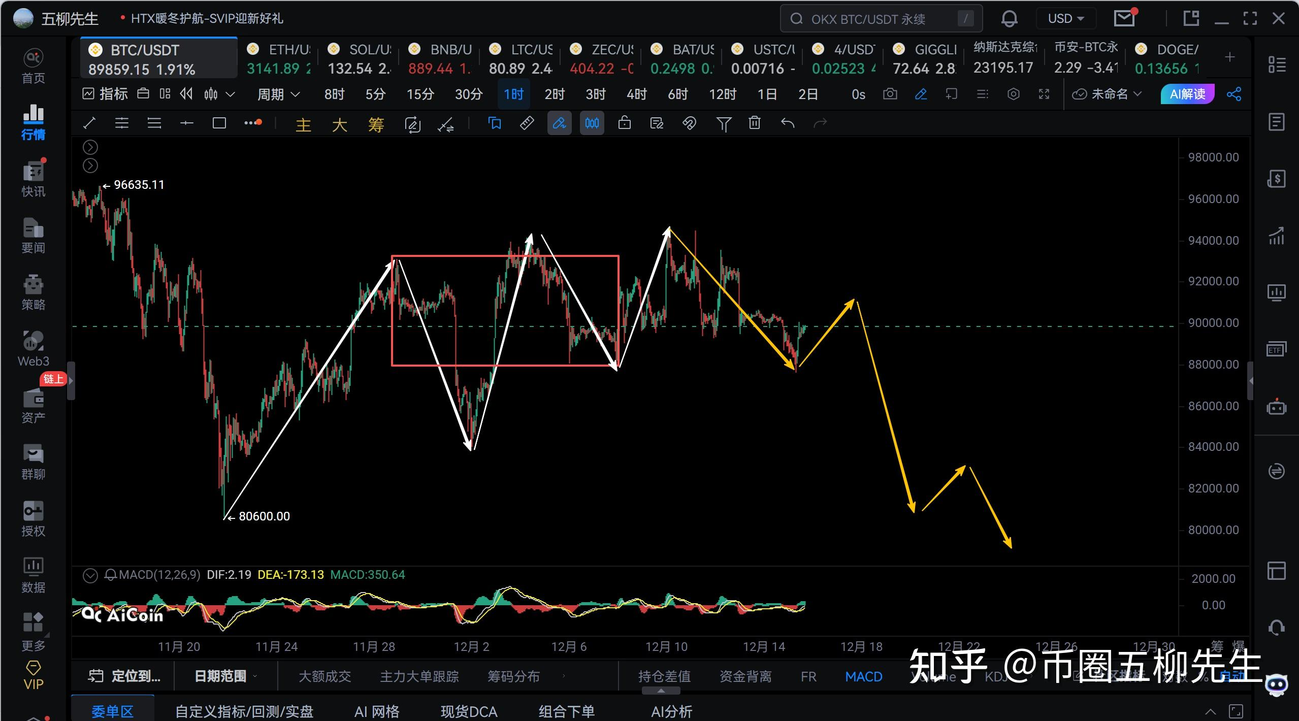 The 4-hour level rebound starting from 80600 is the sixth 4-hour level rebound, peaking at 94588, but the rebound did not break through 95000 to open up space upwards. Therefore, I personally believe that the current 4-hour level decline starting from 94588 still has a probability of breaking below 80600.