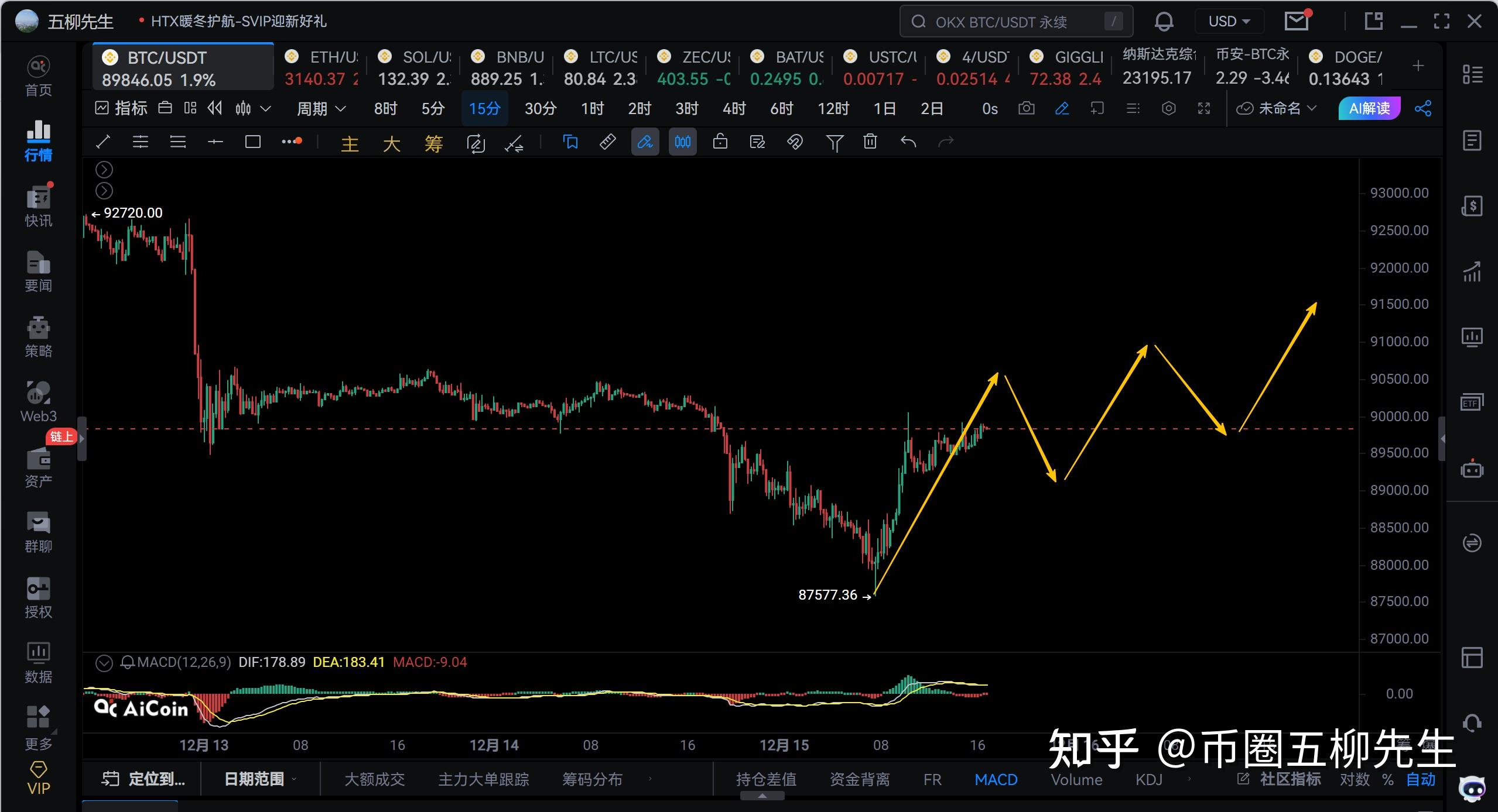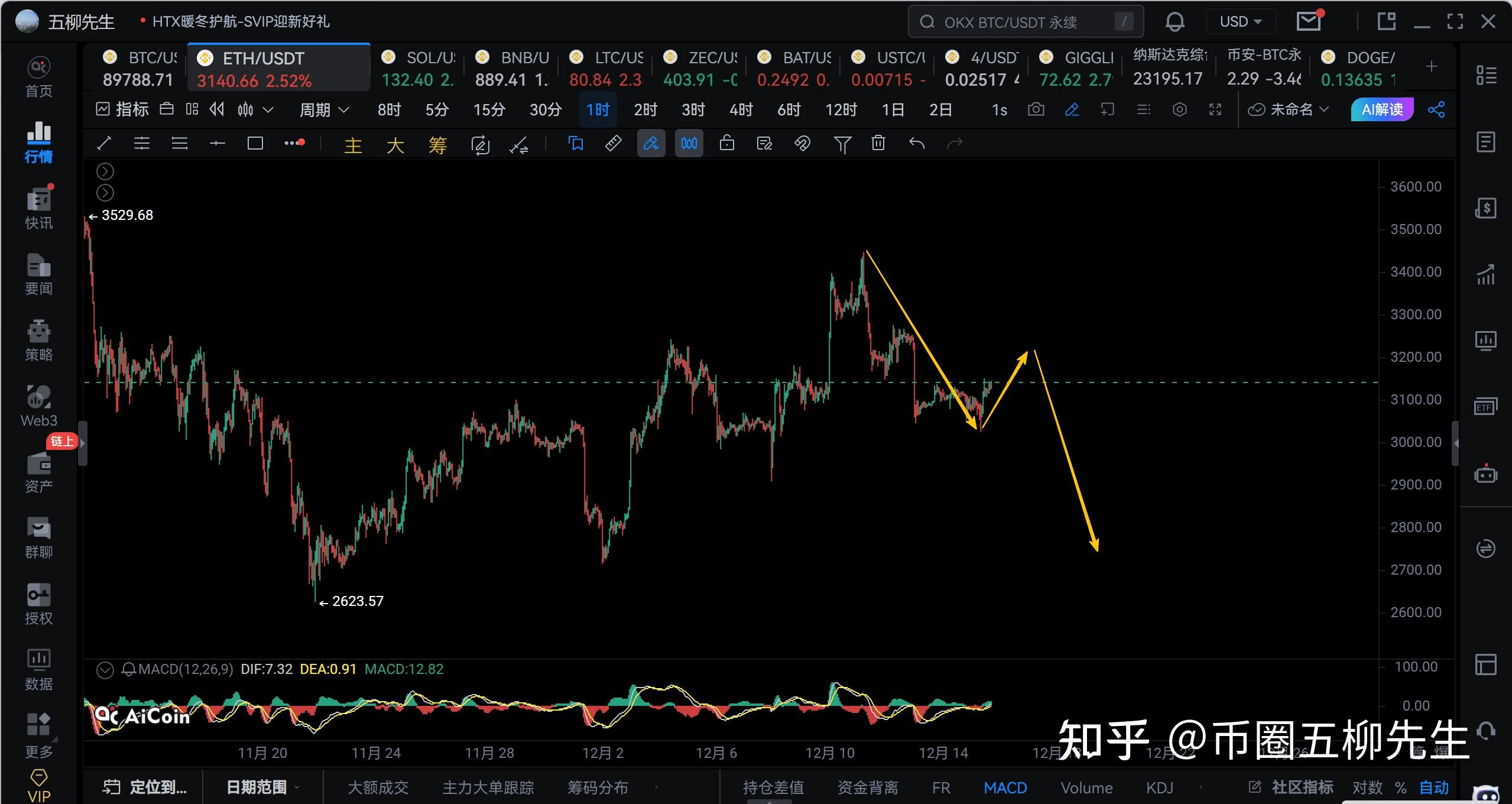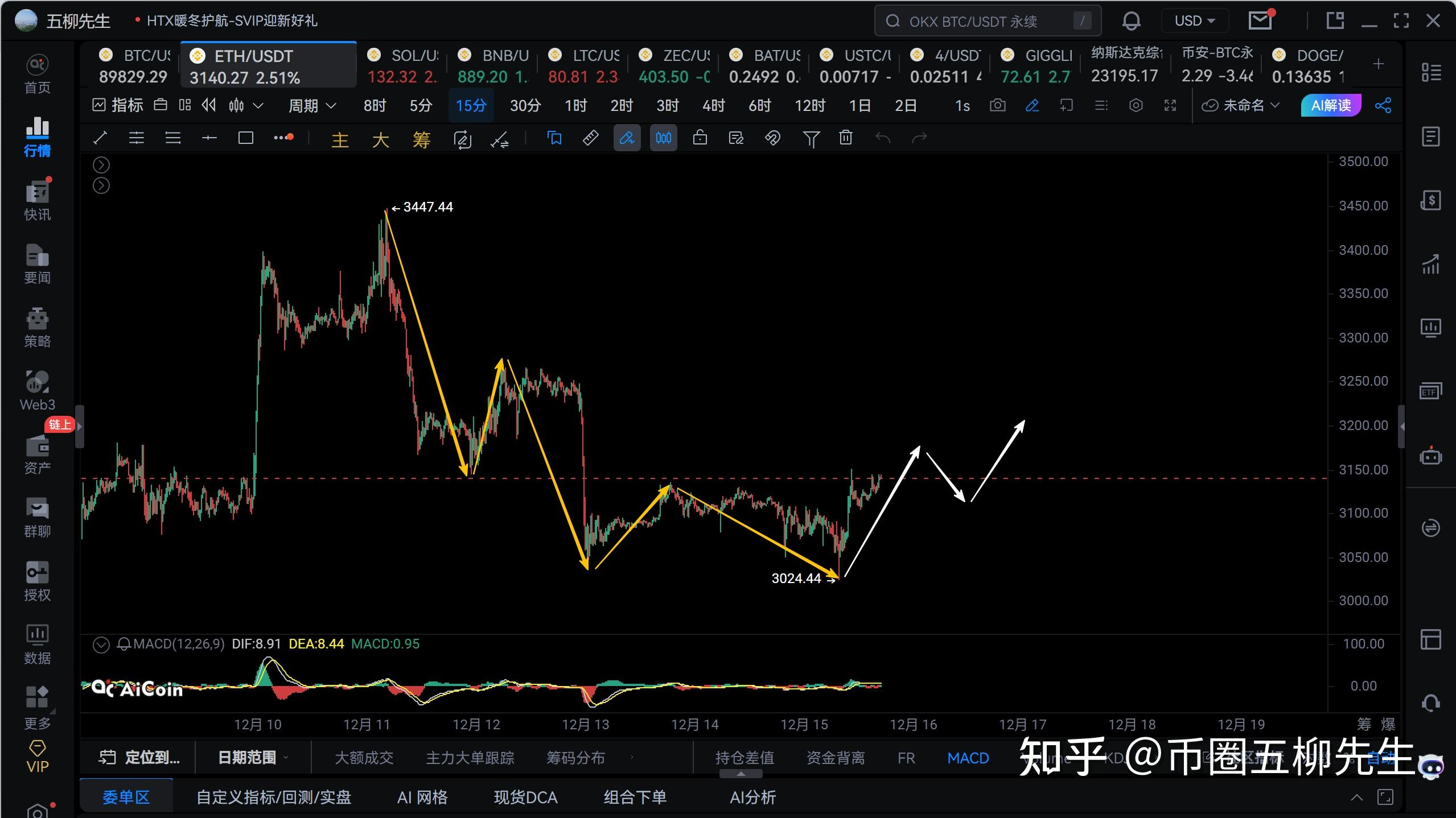 Ethereum 15-minute level, here it is expected to be in the second 1-hour level rebound; this rebound has only completed the first 15-minute level rebound internally, and there will still be a second 15-minute level pullback and a third 15-minute level rebound. The third rebound will see if it touches around 3200.
