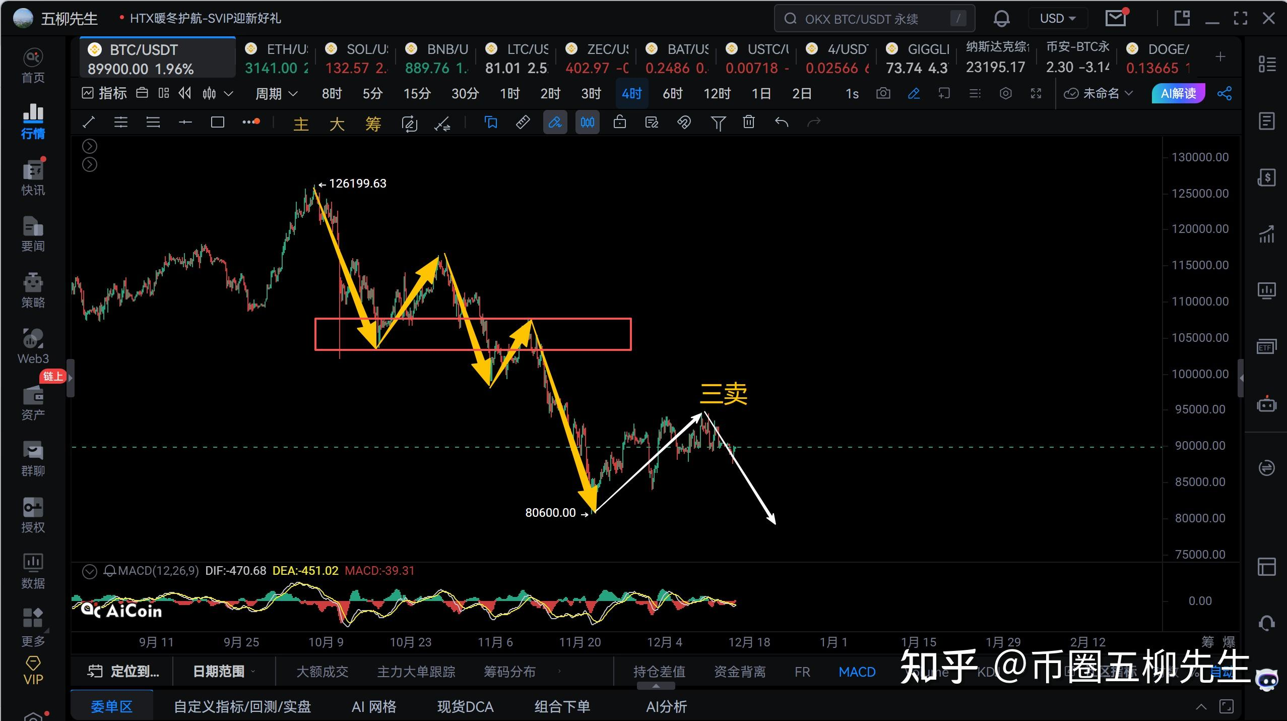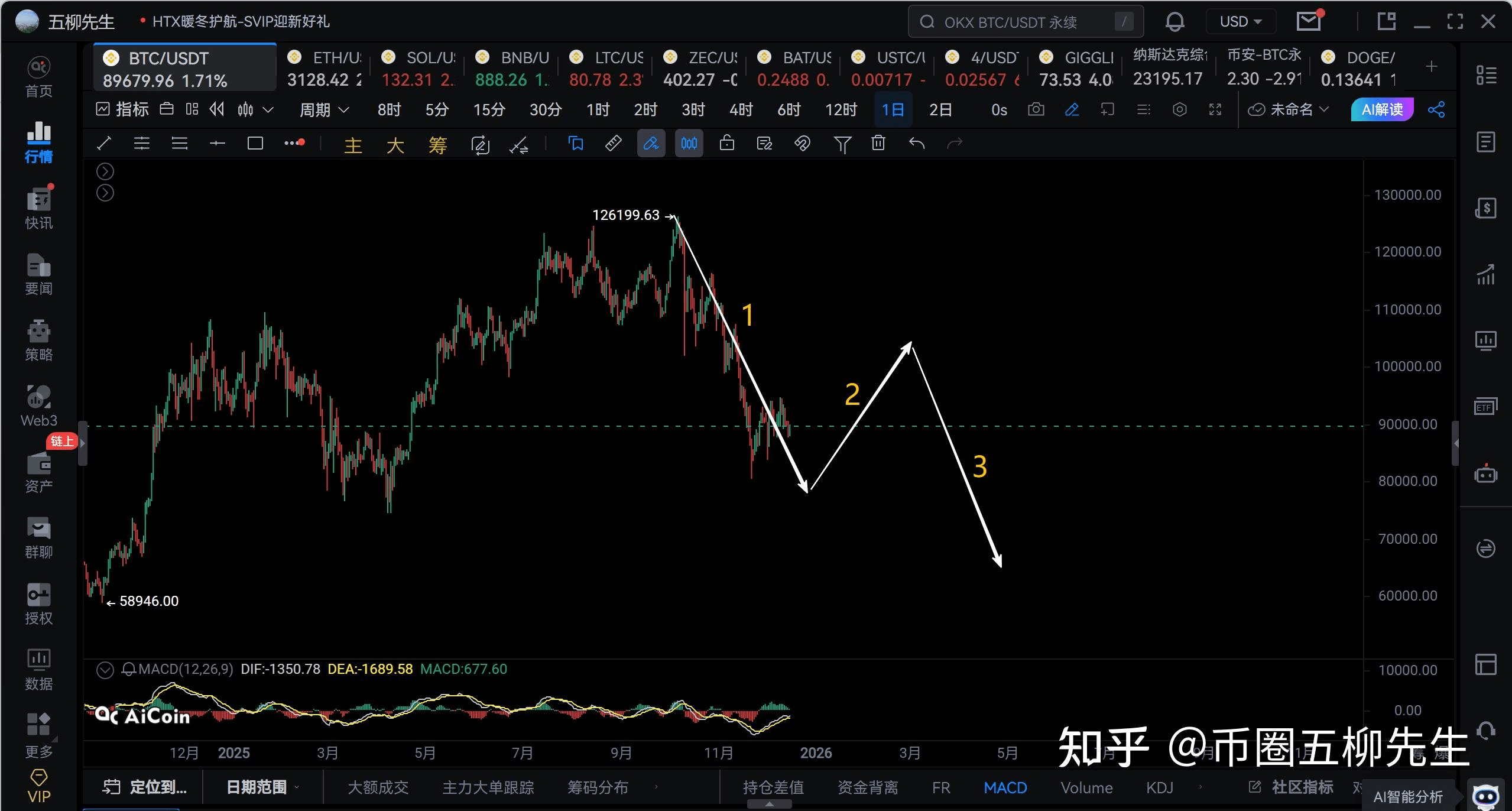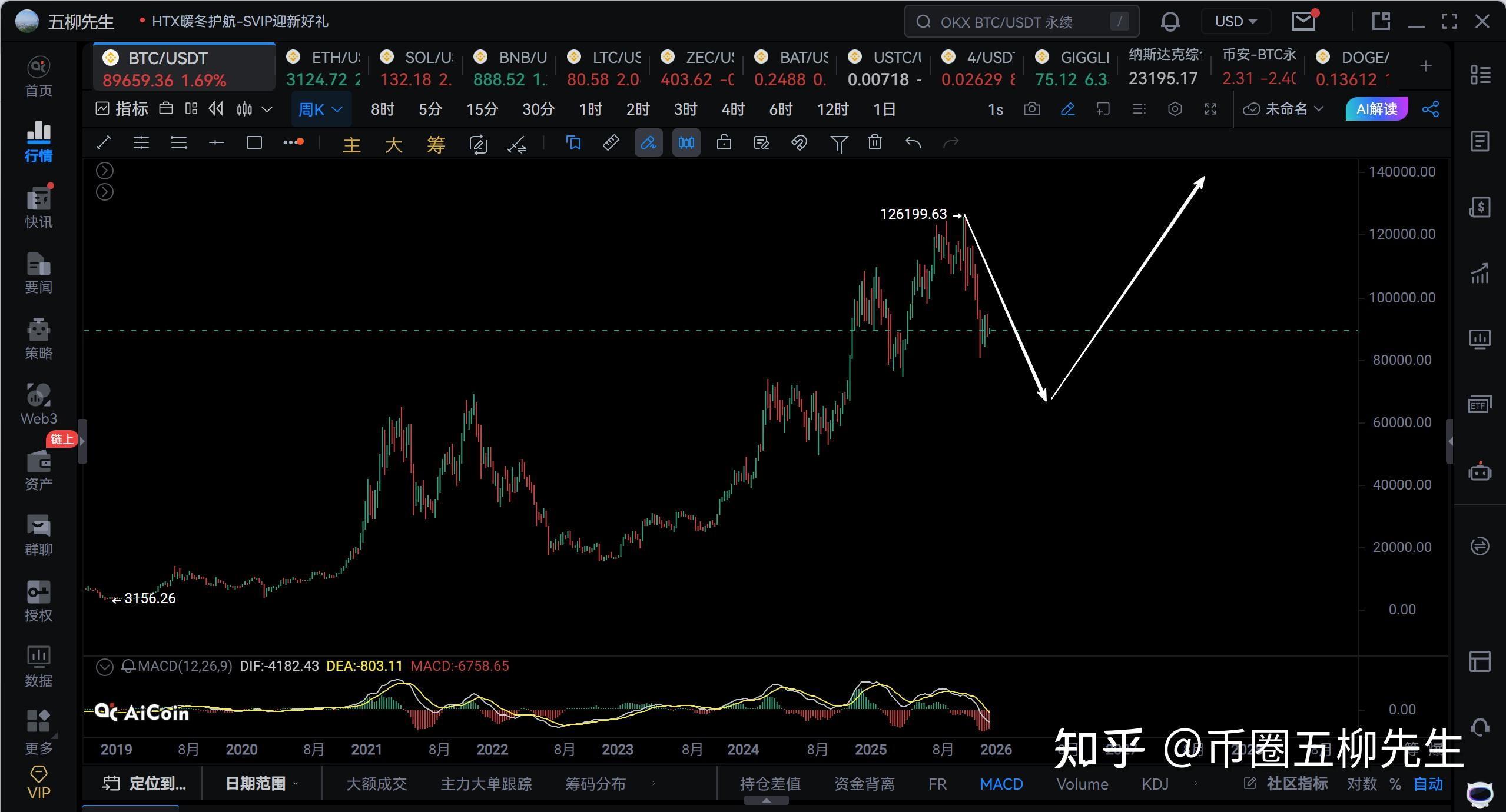 At the weekly level, we first look at the MACD of the weekly chart, which has now started to cross below the 0 axis, and the red energy bars of the weekly MACD are significantly larger than those in the first quarter of 2024 and 2025. Therefore, we can confirm that the big coin's decline starting from 126199 will not stop here. Thus, our conclusion is that the big coin is indeed experiencing a weekly level decline.
