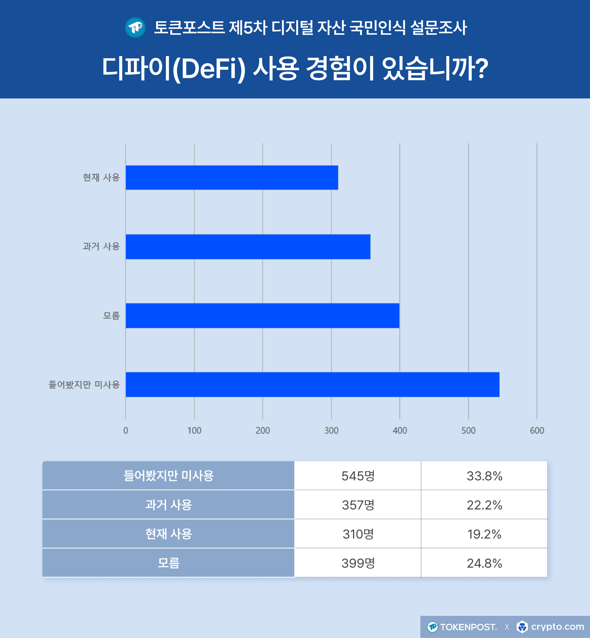 关于DeFi使用经验,"听说过但未使用"的比例最高,为33.8%;而"当前使用"与"过去使用"合计的"有使用经验"比例为41.4%。另一方面,"不知道"的回答也占24.8%,显示出认知度与实际经验并存混合的态势。