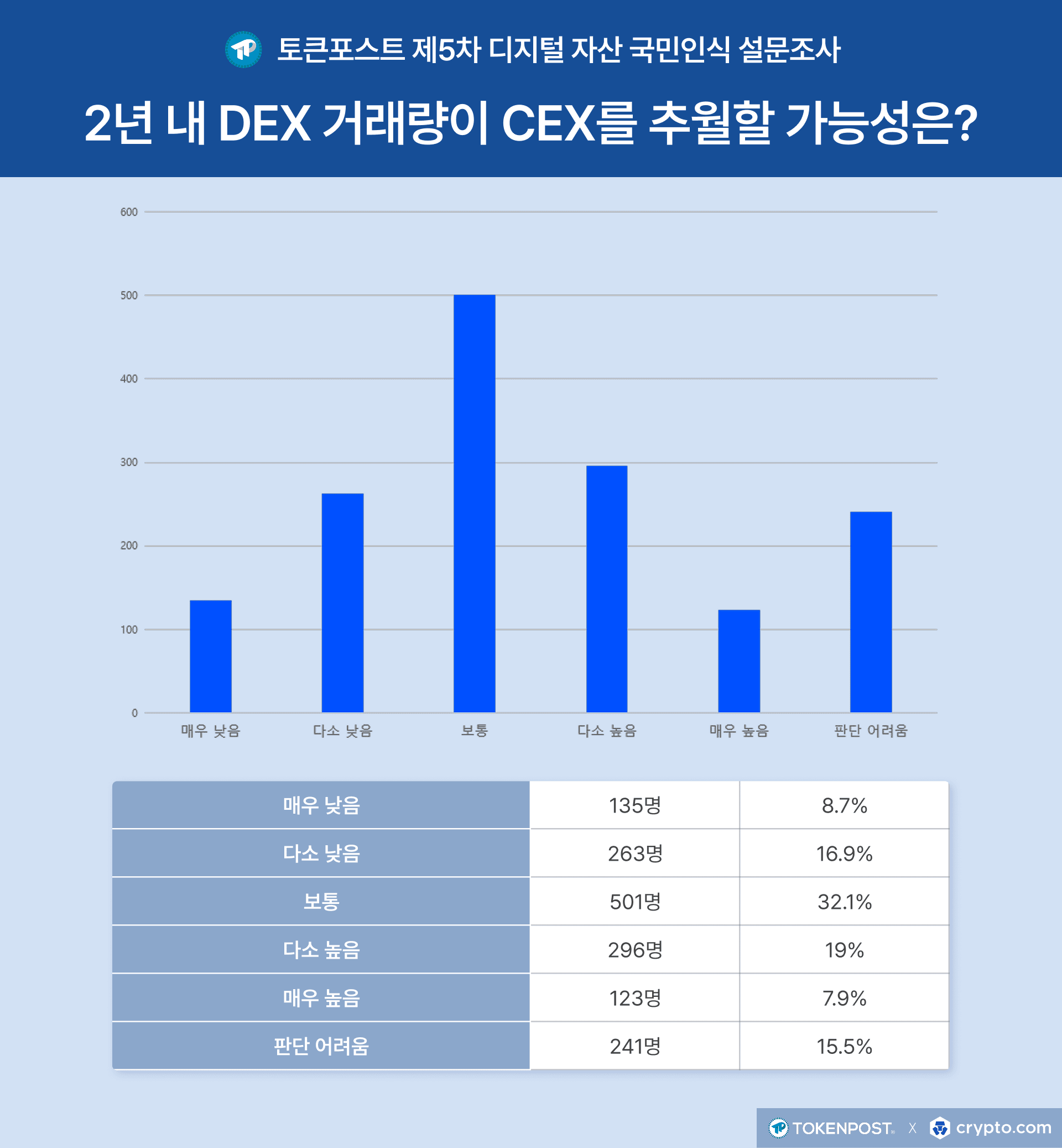 关于两年内去中心化交易所交易量超越中心化交易所的可能性,回答"一般"的比例也最高,为32.1%,且正面与负面回答均有分布。回答"难以判断"的比例也达到15.5%,显示出对扩散前景持保留态度者不在少数。