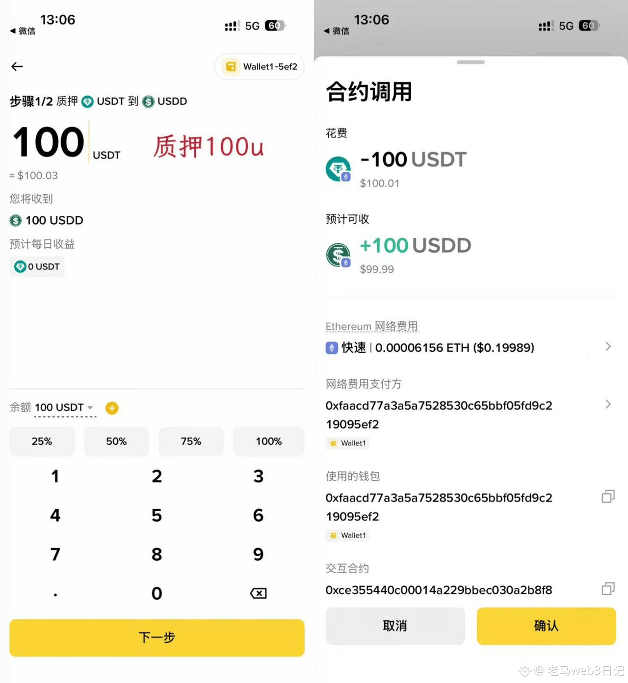 2. 质押USDT兑换USDD,建议质押100U以上,门槛低还能让收益更可观;