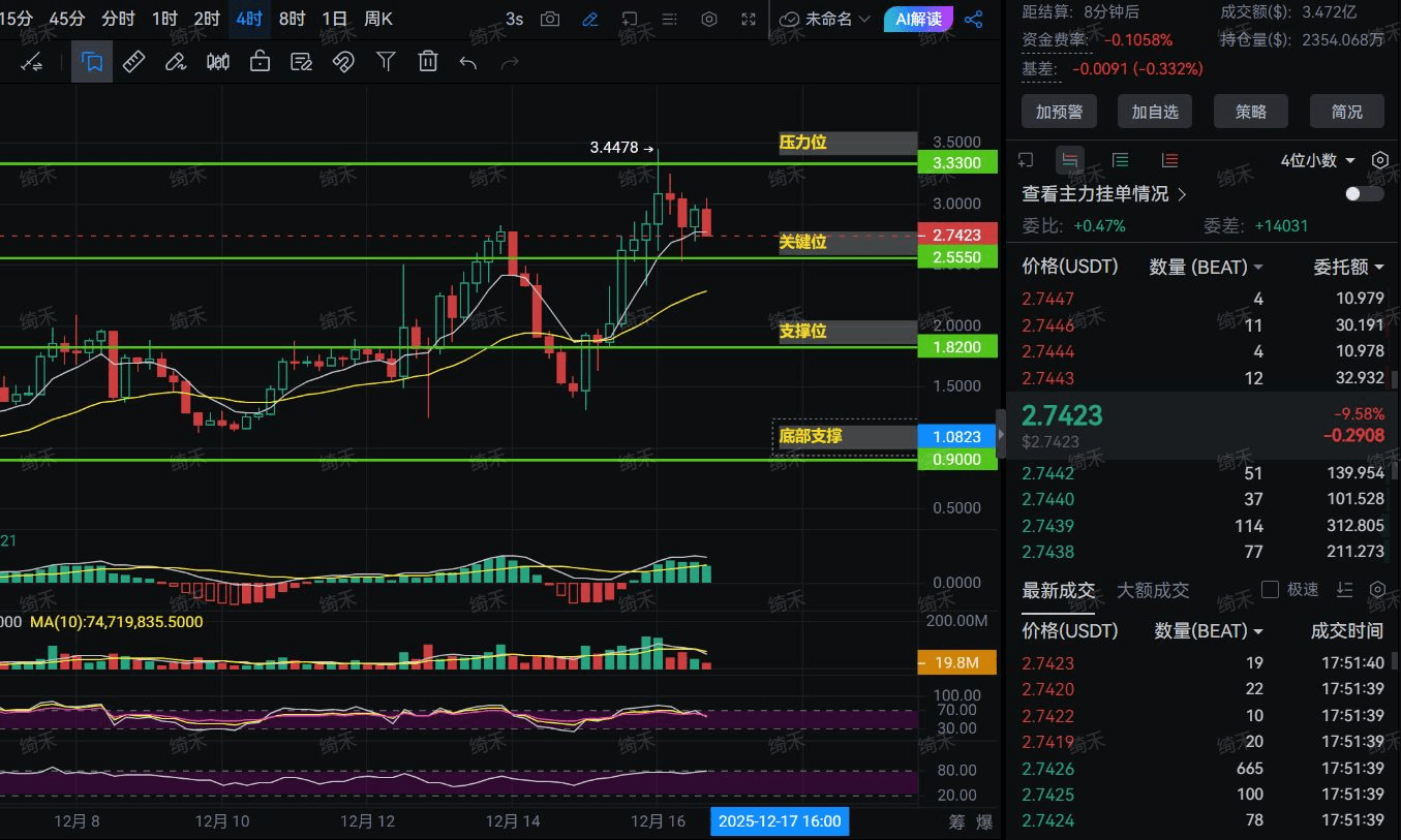 Above, 3.33 and 3.5 are two mountains; below, we are standing right at the 'key level' of 2.7423, like walking a tightrope; below, 2.55 is the next step down, and 1.82 is an important bottom line.