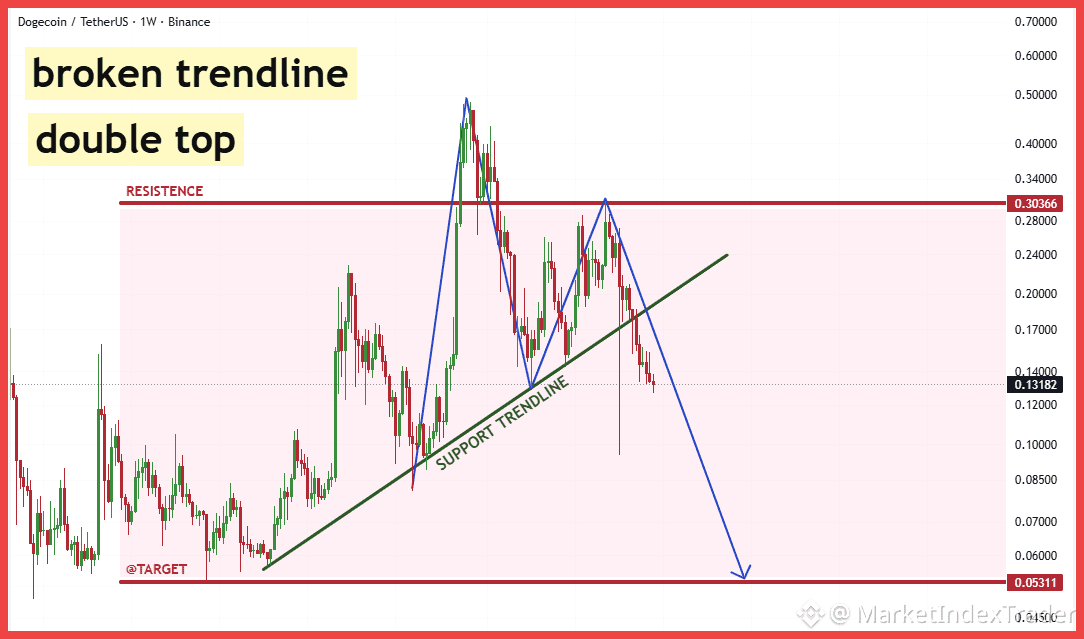 The chart clearly outlines a massive Double Top formation, which is a key reversal pattern after a significant run-up. Crucially, the major upward-sloping Support Trendline (the neckline) has been decisively broken downwards. This bearish breakdown was triggered after DOGE failed to breach the critical resistance at $0.30366.