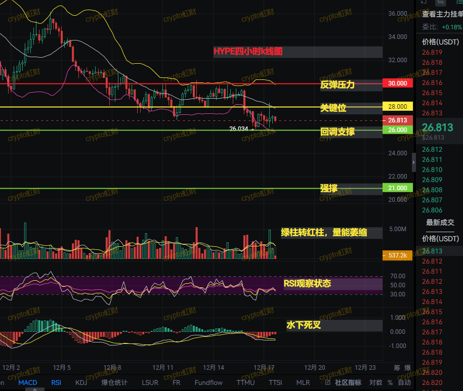 Under the dual pressure of giant whales clearing positions and technical breakdowns, HYPE continuing to decline is a high probability event. The position at 26 may have bulls struggling, but it is likely that they cannot hold on. The real strong support is around 21, where one should consider whether to bet on a rebound. Don't think about bottom-fishing just because it has dropped a lot; the power of the trend is stronger than you imagine.
