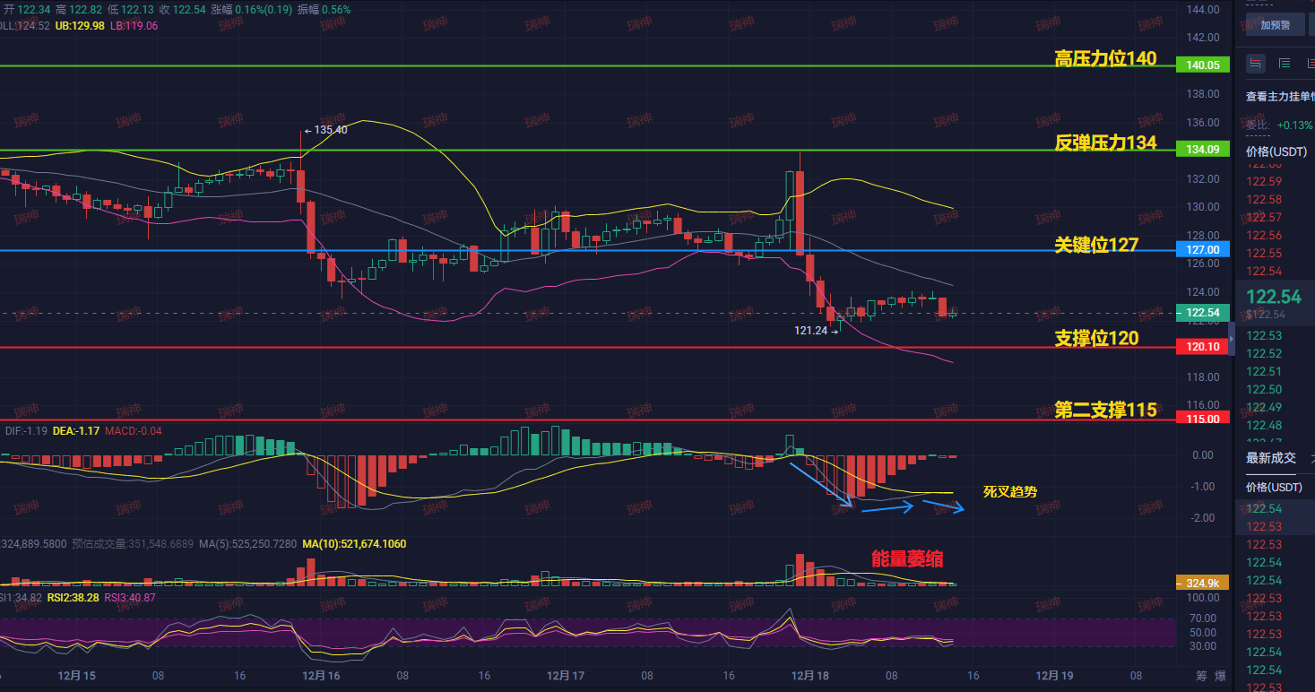 Ruishen's judgment is very direct: the downtrend of SOL is intact, any rebound is a reduction opportunity, not a reversal signal. The most probable trend is: borrowing the ETF good news to fake a rebound to test 127, then turn downwards, first breaking 120, then testing 115.