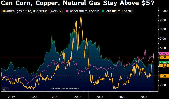 He pointed out that around 2026, commodity prices may fluctuate around a key axis—the 'inflation-deflation dividing line' for core commodities such as natural gas, corn, and copper may fall around 5 dollars, while among these commodities, only copper, which is supported by real industrial demand, is likely to remain above that axis by the end of 2025.