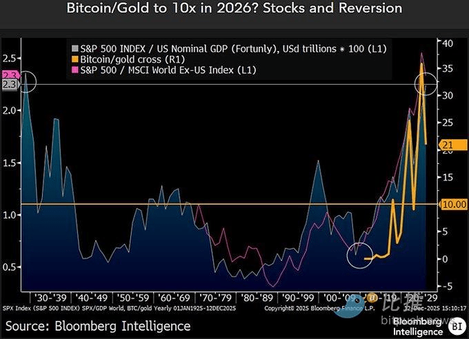 Secondly, it is the relative pricing relationship between Bitcoin and gold. McGlone particularly emphasizes the Bitcoin/gold ratio as an indicator. This ratio was about 10 times at the end of 2022 and then rapidly expanded under the bullish market, reaching over 30 times at one point in 2025. However, since the beginning of this year, this ratio has fallen by about 40%, down to around 21 times. In his view, if deflationary pressures persist and gold remains strong due to safe-haven demand, then it is not an aggressive assumption for the ratio to further return to historical ranges.