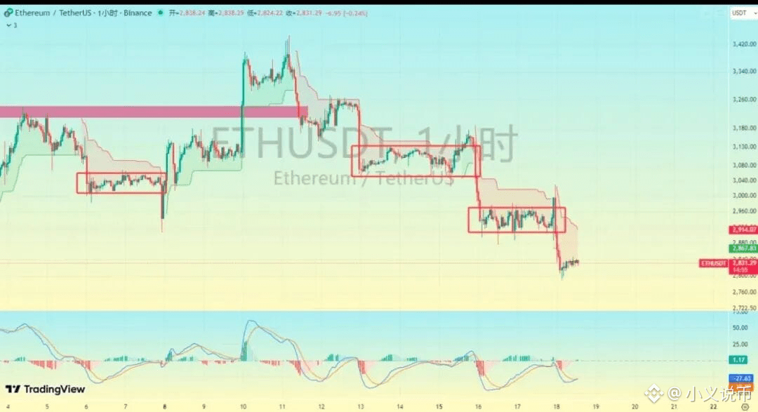以太坊近期表现弱于比特币,跌幅更为明显。从小级别走势观察,多次出现横盘后假突破再加速下跌的循环模式,显示市场情绪较为脆弱。