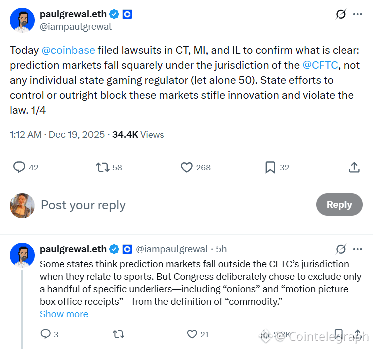 In a Friday X post, chief legal officer Paul Grewal said Coinbase filed the cases “to confirm what is clear: prediction markets fall squarely under the jurisdiction of the @CFTC, not any individual state gaming regulator (let alone 50).”