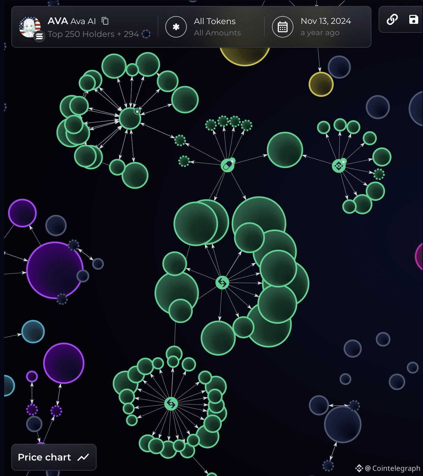The sybil wallet cluster related to the deployer shared similar patterns, including being funded in a tight time window through Bitget and Binance, receiving similar amounts of Solana (SOL) and having no blockchain activity before buying up the Ava AI (AVA) token supply at launch, Bubblemaps claimed in a Thursday X post.